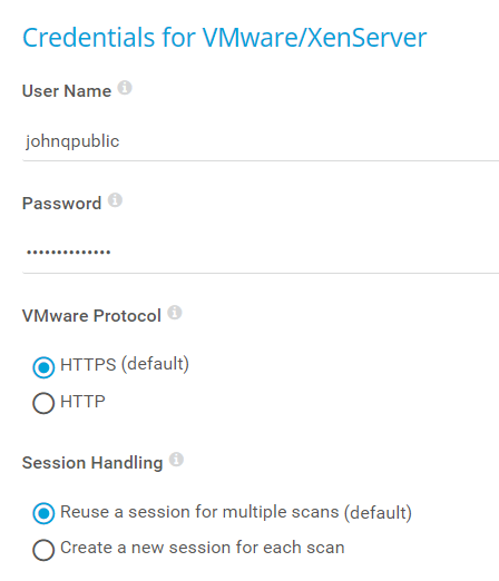 Reuse a session for multiple scans (default): Select this option if you want a VMware sensor to reuse a single session for multiple sensor scans to query data. With this option, the sensor does not need to log in and out for each sensor scan. We recommend that you use this option because it reduces network load and log entries on the target device. This can increase performance.