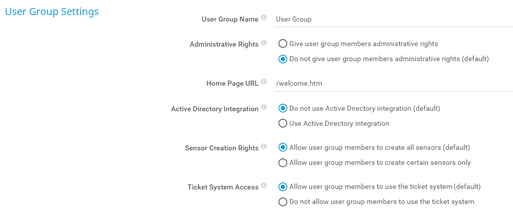 • Do not give user group members administrative rights (default): Do not give the user group member administrative rights. Access to device tree objects, libraries, maps, and reports for user group members are defined in an object's settings.
